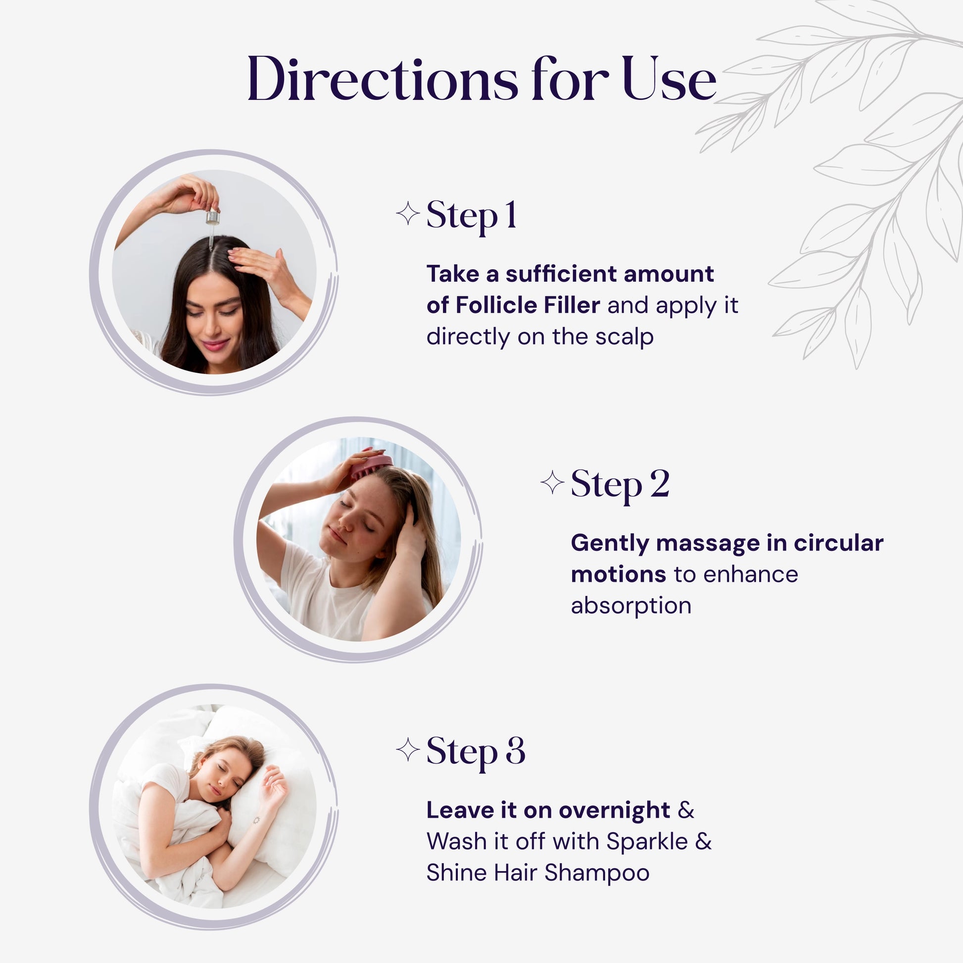 Apply sufficient quantity of serum directly on the scalp, Gently massage in circular motions to enhance absorption and leave it for overnight and wash with Posypolish Sparkle & Shine hair shampoo. For effective result apply daily.